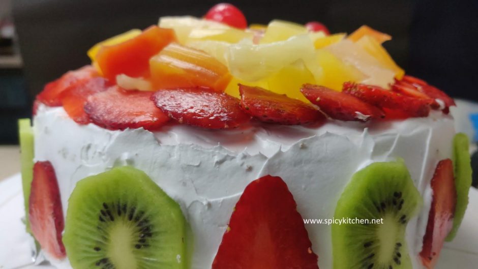 Fruit cake is a unique and delicious cake made with fresh fruits. The crunchy taste of fruits with soft cake and cream is heavenly. I made this cake for the new year and everyone liked this colorful cake. My kids love to eat fruits So I planned to try this cake, tried it, and came out well. The cake tastes delicious for the next day. So try to bake, do the icing, and keep in the refrigerator for 12 hours then decorate it with fruits.