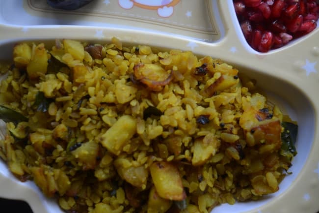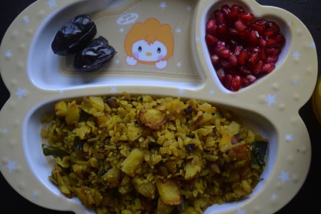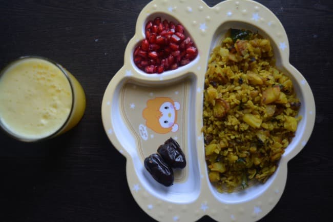 Kids breakfast menu – poha (beaten rice), pomegranate dates and orange juice. This is the second day of my kids breakfast menu week. First day breakfast menu was Set Dosa and Roasted gram chutney. Today I would like to share one healthy upma recipe with poha/beaten rice/aval.